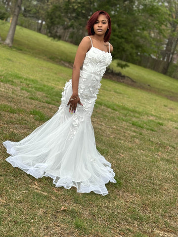Off Shoulder Puff Sleeve Mermaid Hem 3D Flower Dress