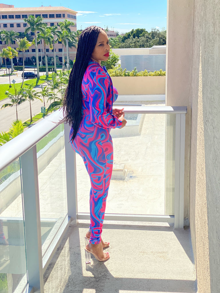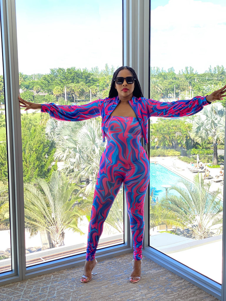Two piece set, Tube jumpsuit, Crop jacket, Round neckline, Long sleeves, Zipper closure.